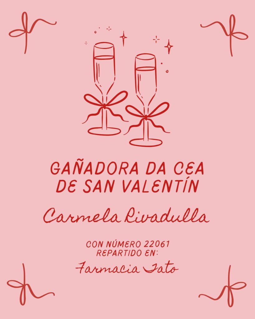 No caso do sorteo da Cea de San Valentín, a persoa afortunada foi Carmela Rivadulla, co número 22061, repartido no establecemento Farmacia Tato.